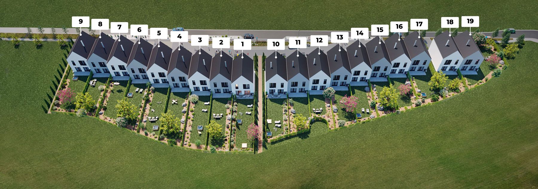 - V projektu je celkem 19 dvoupatrových rodinných domů s vlastní garáží a zahradou.